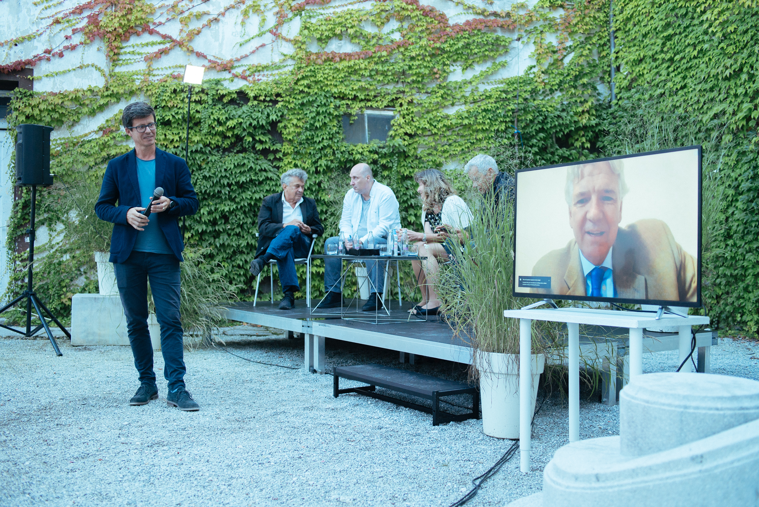 Der Kurator von Swim City und Direktor des Schweizer Architekturmuseums Andreas Ruby, der Staatssekretär des Umweltministeriums Robert Rožac, der Vizebürgermeister von Ljubljana Janez Kozelj und der Bürgermeister von Maribor Saša Arsenovič haben an der von dem Leiter des MAO Matevž Čelik moderierten Debatte teilgenommen.