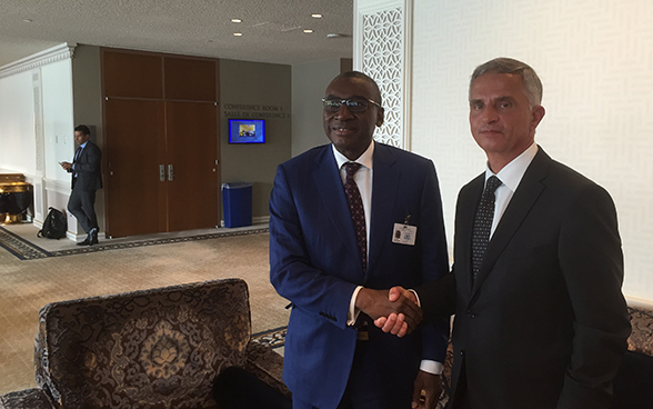 Il consigliere federale Didier Burkhalter discute con il Ministro della Giustizia del Senegal, Sidiki Kaba. © DFAE
