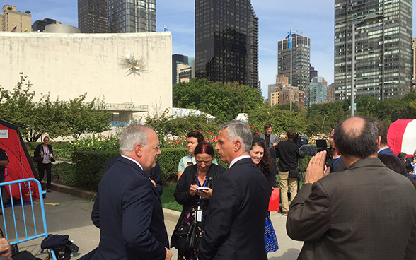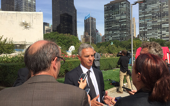Il consigliere federale Didier Burkhalter parla con i giornalisti davanti alla sede dell'ONU a New York. © DFAE