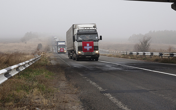 26.10.2015 – Un convoglio costituito da 20 camion con circa 293 tonnellate di merci ha raggiunto Donetsk. Trasportava, tra l’altro, solfato di alluminio e cloro per le centrali idriche del Donbas, nonché farmaci oncologici. © DFAE