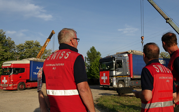 06.06.2017 – Nel Sud-Est dell’Ucraina, alcuni membri dell’Aiuto umanitario svizzero controllano le operazioni di carico di un nuovo convoglio umanitario. © DFAE