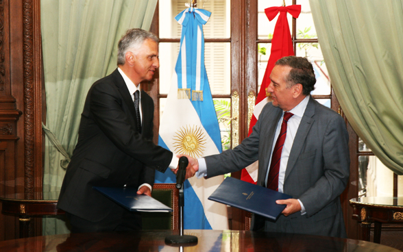 Il consigliere federale Didier Burkhalter ha firmato un accordo relativo a un programma di ricerca comune con il ministro argentino della scienza Lino Barañao. © DFAE
