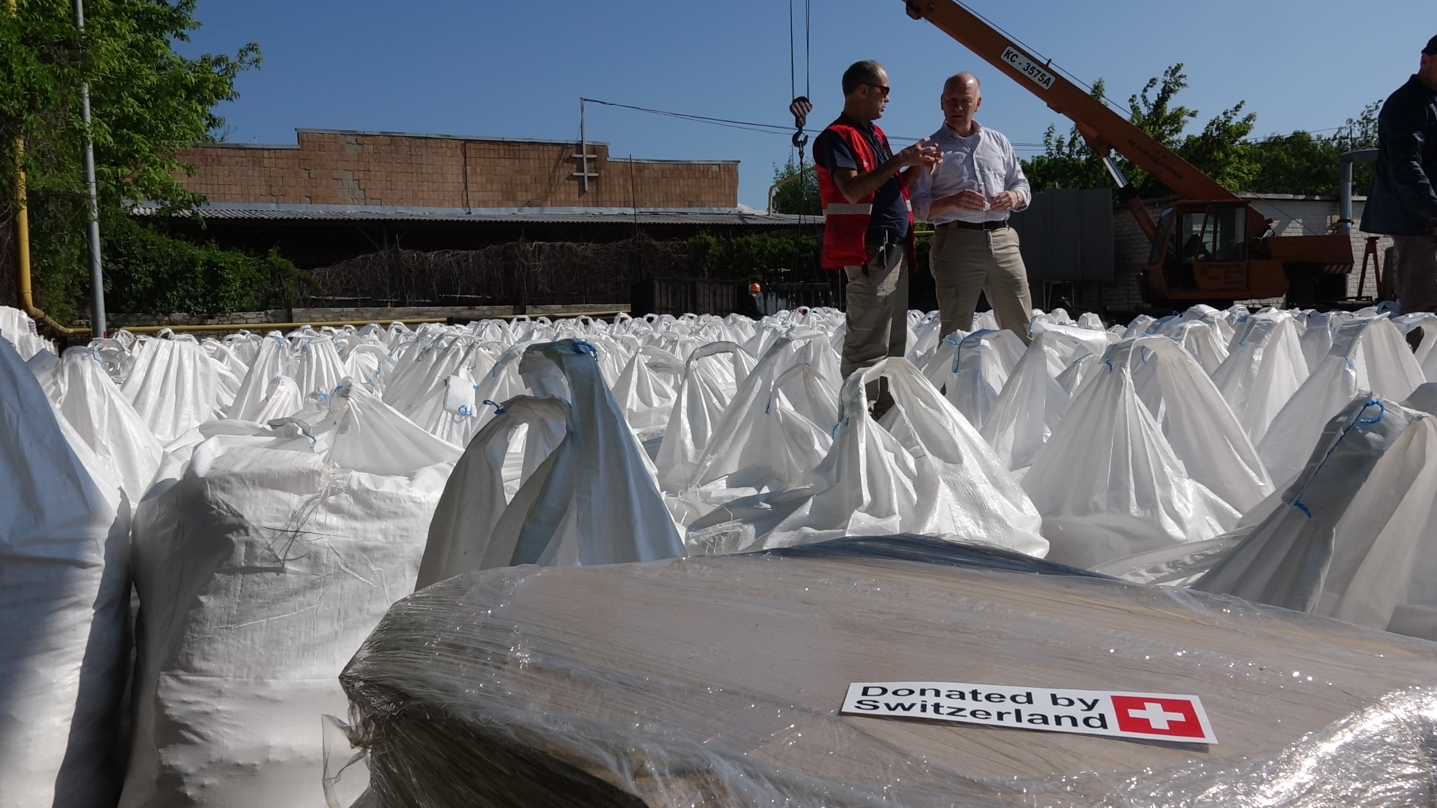 Questi sacchi pieni di solfato d'alluminio sono stati trasportati nell'Ucraina orientale. © DSC © DFAE