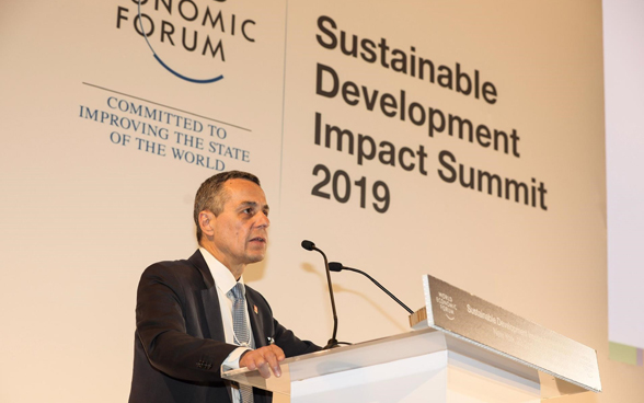 Il consigliere federale Ignazio Cassis parla al evento del WEF sullo sviluppo sostenibile. © DFAE